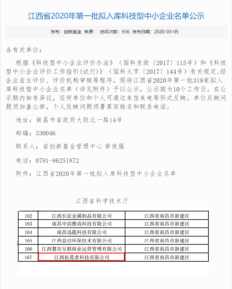 2020年3月4日,江西拓荒者科技有限公司榮選江西省擬入庫科技型中小企業(yè)名單。