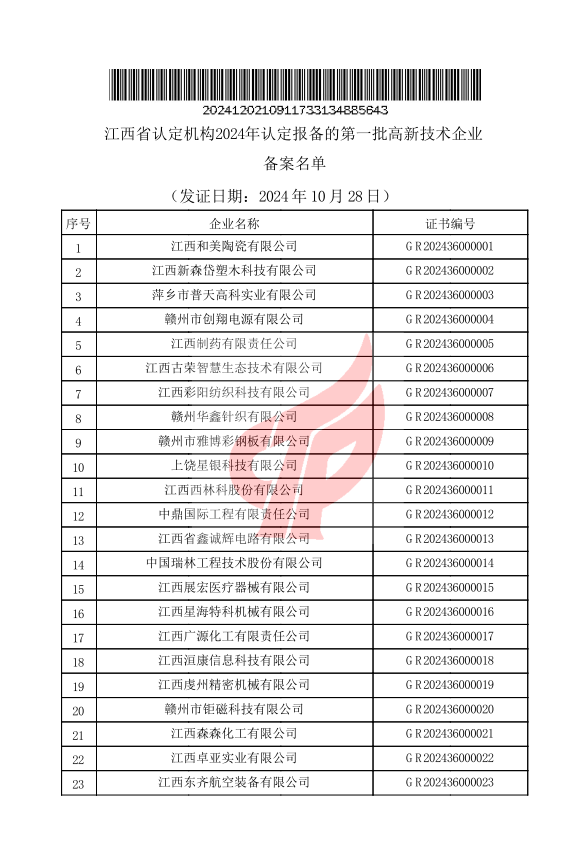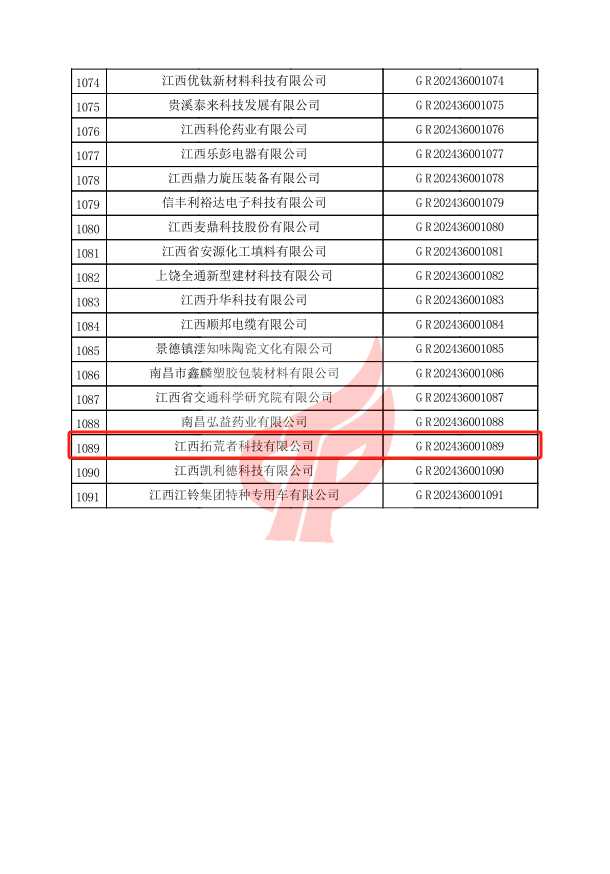 近日,高新技術企業認定管理工作網正式公布了2024年江西省第一批認定報備的高新技術企業名單。經過相關部門的嚴格評審與綜合考量,江西拓荒者憑借其在科技創新、產品研發及企業綜合發展等方面的卓越表現,再次榮獲“國家高新技術企業”稱號,這是對公司持續創新能力的高度認可。