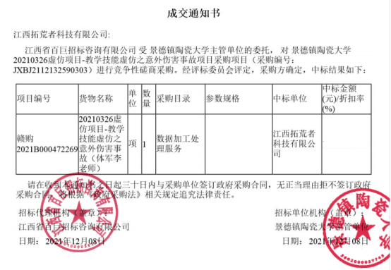 我司在“景德鎮(zhèn)陶瓷大學(xué)虛仿項(xiàng)目-教學(xué)技能虛仿之意外傷害事故項(xiàng)目”招標(biāo)中,從眾多競爭對(duì)手的角逐下脫穎而出,一舉中標(biāo)。本次中標(biāo),再次見證了我公司全體員工的辛勤付出。過硬的產(chǎn)品質(zhì)量、雄厚的虛仿技術(shù)、合理的價(jià)格、誠實(shí)守信的經(jīng)營方式、完善的服務(wù)體系,讓我們這次能在眾多公司中嶄露頭角。